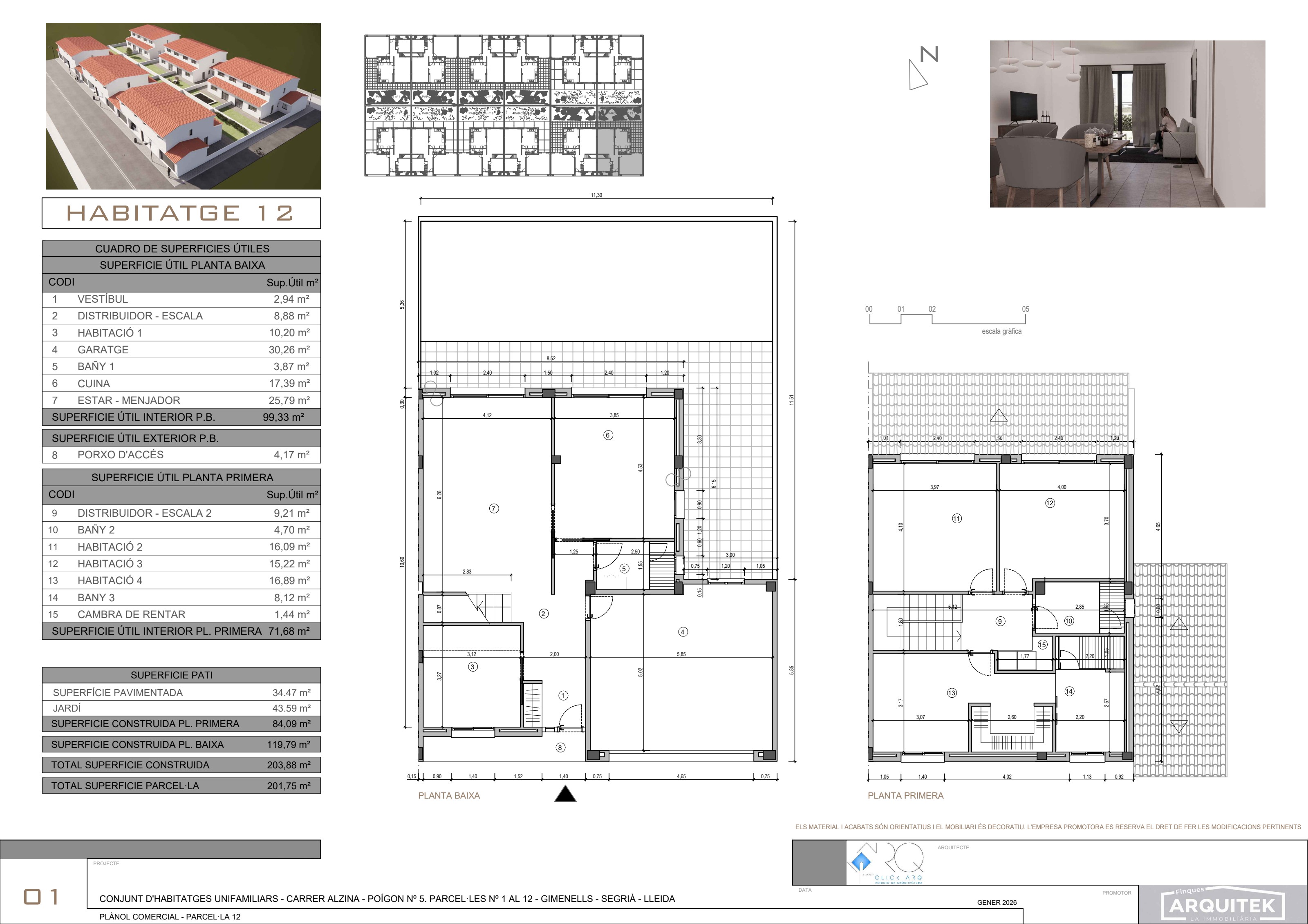 Cada habitatge combina 203 m² construïts en dues plantes, 4 habitacions, garatge privat i jardí. Un projecte pensat per a famílies que busquen qualitat de vida, natura i proximitat a Lleida.
